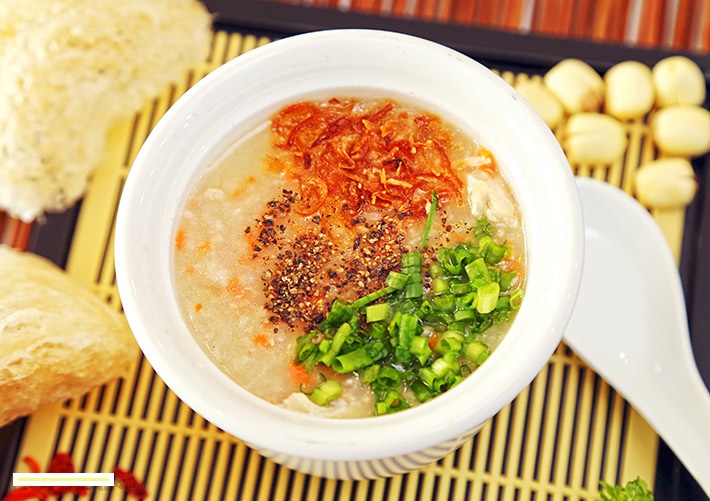 Bạn cho cháo ra tô, để tổ yến lên trên, rắc ngò & tiêu, dùng nóng.